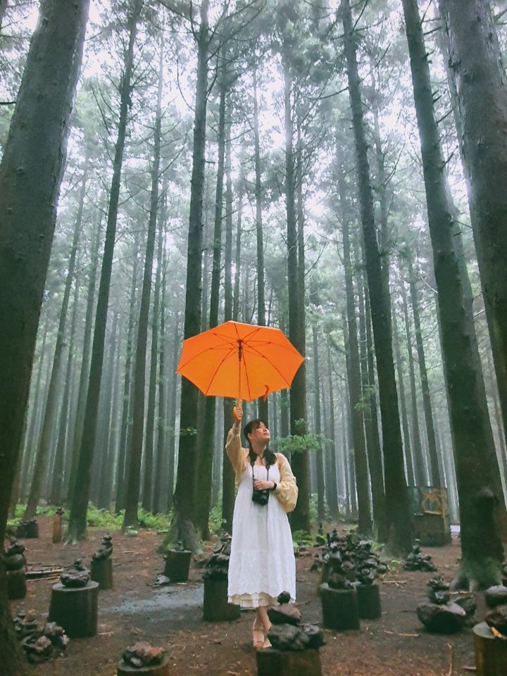 "안개 자욱한 비밀의 숲속에 나타난 요정님 같아! 🧚♀️✨ 몽환적이면서도 오렌지 우산 하나로 분위기 확 살리는 거 ㄹㅇ 신의 한 수! 🧡🌊"