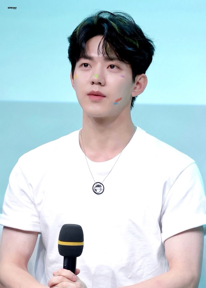 수줍은 듯하면서도 멍하니 어딘가를 응시하는 저 눈빛... 🥹 볼에 붙은 스티커까지 합쳐져서 귀여움 한도 초과야! 근데 마이크 잡은 손이랑 팔 근육은 또 왜 저렇게 설레게 해? 😭💪