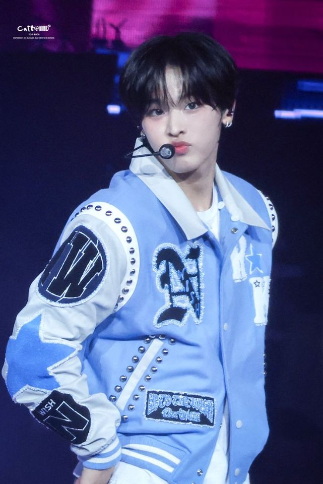 하늘색 바시티 자켓에 패치 디테일... 이건 그냥 '하이틴 남주' 그 자체지! 🏈💙 스포티하면서도 힙한 느낌이 얘 비주얼이랑 만나서 시너지 폭발함! 패션의 완성은 얼굴인 거 ㅇㅈ? ㅇㅇㅈ!