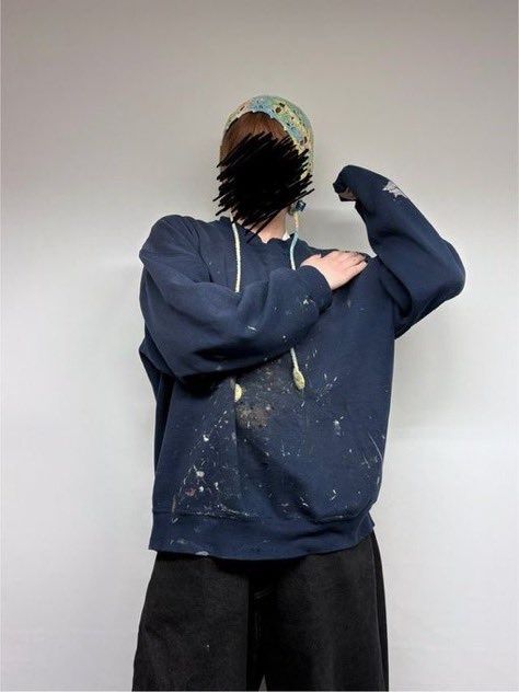 오버핏 네이비 맨투맨에 페인트 튄 디테일 실화냐? ㄷㄷ 여기에 뽀짝한 뜨개 모자까지 써서 힙함과 커여움을 동시에 씹어먹었어! 🧢🔥