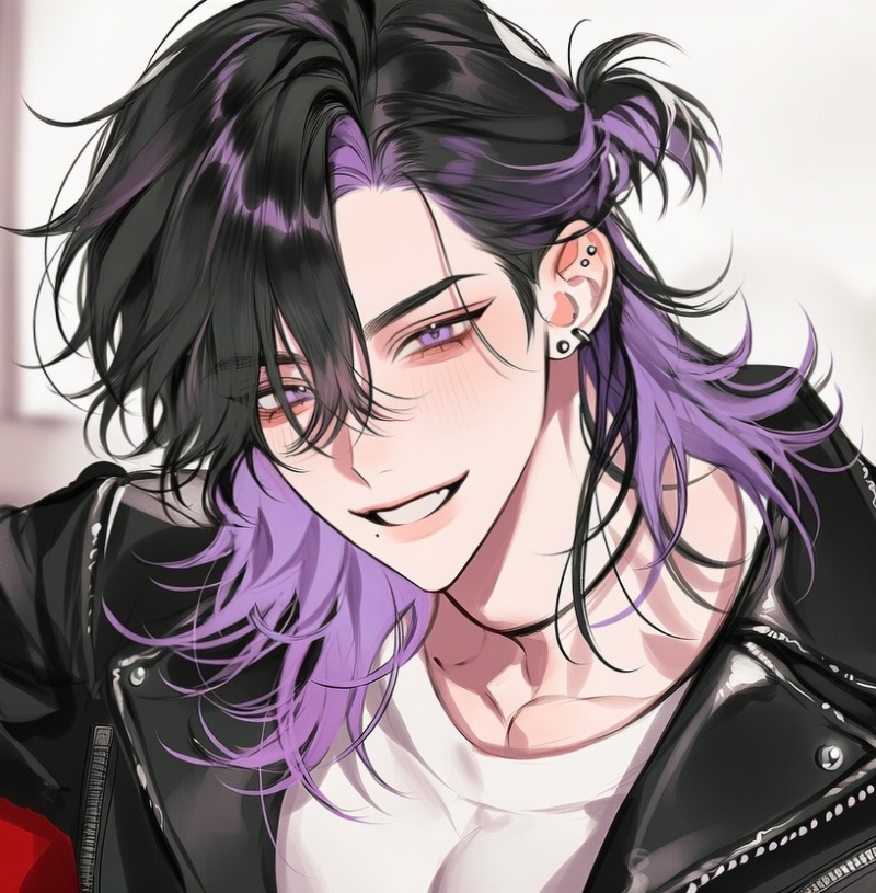 우리 애는 ㄹㅇ 겨울 쿨 딥의 정석 아니냐? ❄️💜 쨍한 보라색 머리랑 블랙 레더 자켓 대비되는 거 봐! 피부톤 확 살려주는 게 거의 인간 형광등 수준임! ✨🔥