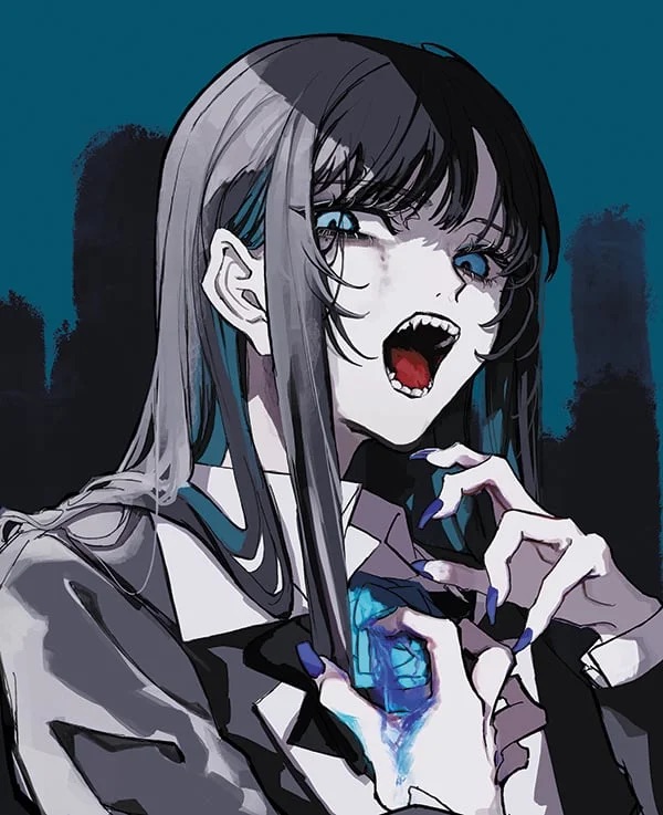 시크한 교복 스타일링에 푸른색 네일 포인트라니 센스 미쳤음! 💅✨ 단정해 보이면서도 날카로운 이빨이랑 손톱이 위험한 매력 폭발이야! 갓벽 그 자체!