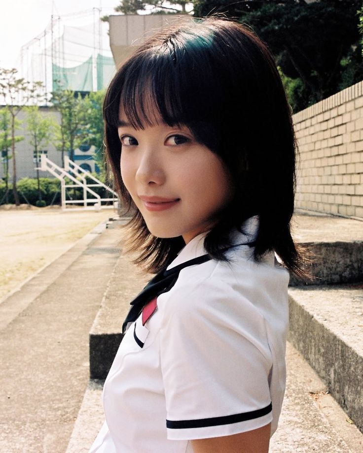 갓벽한 단발 레이어드 컷에 교복 핏 실화냐! 흑발이 이렇게 찰떡일 수가 없음! 🖤 깔끔한 화이트 셔츠에 리본 포인트가 우리 애의 단정한 매력을 200% 살려줌! 갓-벽! 💯👔